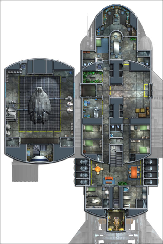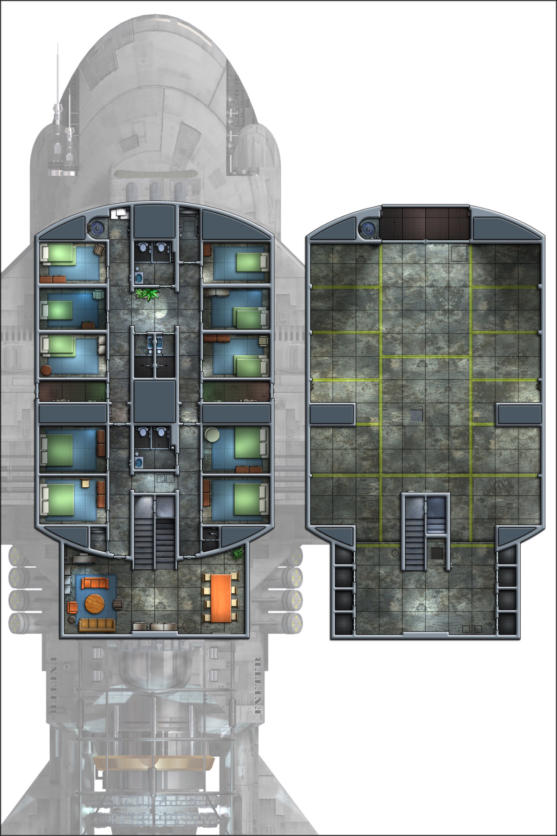 ebenerdigen Zugang hat. In der Werkstatt (7) findet man meist die Roboter, die sich hier in ihrer “Freizeit” aufladen. Im Heck des Hauptdecks